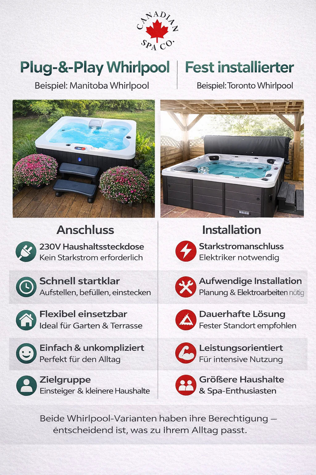 Alle Whirlpools der Canadian Spa GmbH bieten eine unschlagbare Kombination aus großartigem Preis-Leistungs-Verhältnis, hochwertiger Ausstattung und Design. Unsere Whirlpools kommen mit wertvollem Kundenservice und technischer Unterstützung für die gesamte Lebensdauer des Wirlpools. Unsere Whirlpools verwenden originale nordamerikanische Komponenten wie Balboa.